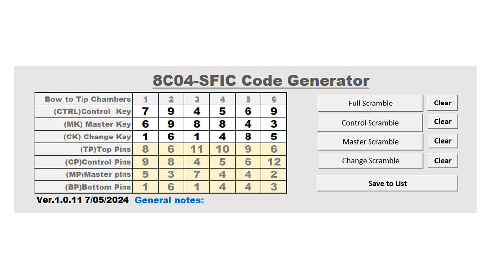 Input existing Schlage KD or MK Key codes into the 8C04-SFIC Code Generator to create the pinning chart.